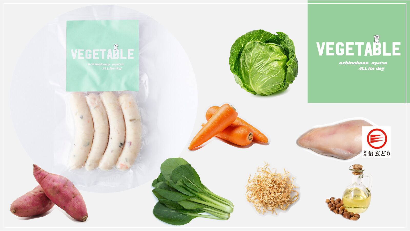 信玄鶏胸肉、サツマイモ、でん粉、キャベツ、ニンジン、小松菜、切り干し大根、アルガンオイル